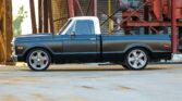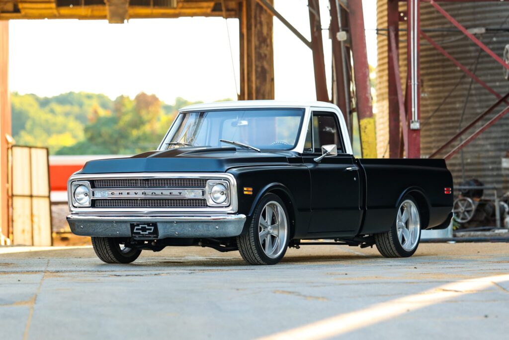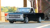 Refinished in matte black and white, this C10 packs a cammed 5.3L Vortec V8 with a 4-speed auto, LSD, Wilwood disc brakes, and a lowered suspension. Features include 20″ U.S. Mags wheels, short-tube headers, AC, black leather TMI seats, Dakota Digital gauges, and more.